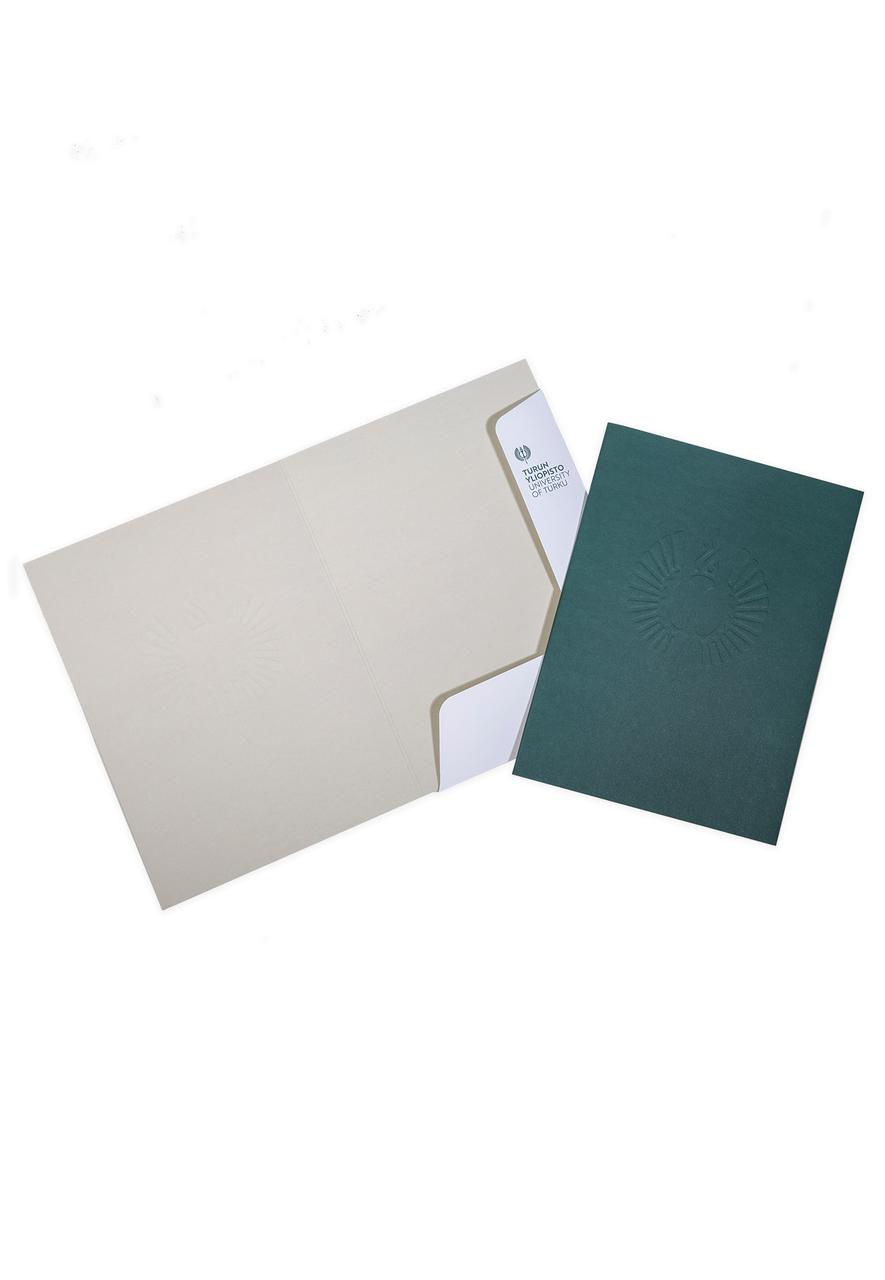 Turun yliopiston kansio, kartonkia. Kansio soveltuu A4-kokoisille papereille, koko (taitettuna) on 225 mm x 305 mm, selkä 3 mm.