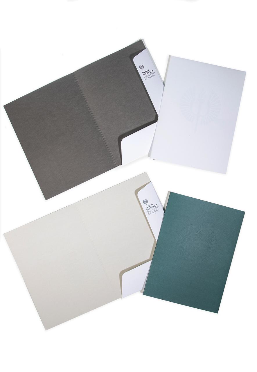 Kansiota on saatavilla kahta eri väriä: vihreä-beigen kansi on vihreä ja sisäosa beige, kaneessa siipisoihtu kohopainatuksena. Musta-valkoisen kansi on valkoinen ja sisäosa musta, kannessa siipisoihtu lakkauksena. Molemissa yliopiston kaksikielinen logo.