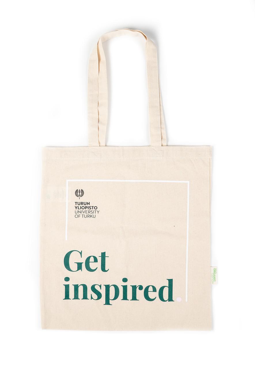 GOTS-sertifioidusta orgaanisesta luomupuuvillasta vastuullisesti valmistettu kangaskassi on OEKO-Tex -sertifioitu ja valmistettu Intiassa. Kassin väri on natural, 4-väripainatus kassin toisella puolella sisältäen Turun yliopiston kaksikielisen logon ja Get inpired. -sloganin. Kassi kestää jopa 5 kg painon. Kassin koko on 36 cm leveä ja 40 cm korkea, kantokahvat 32 cm pitkät.