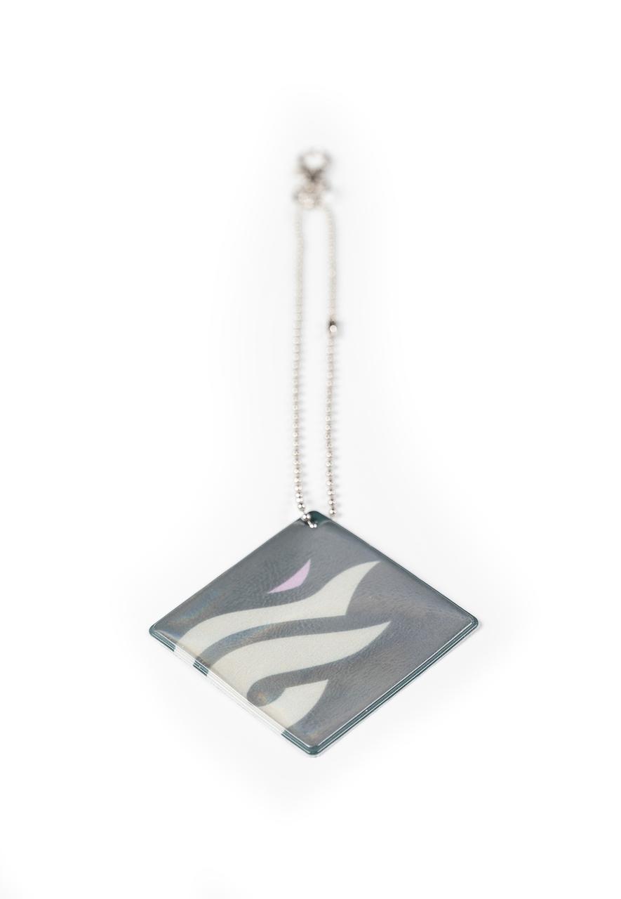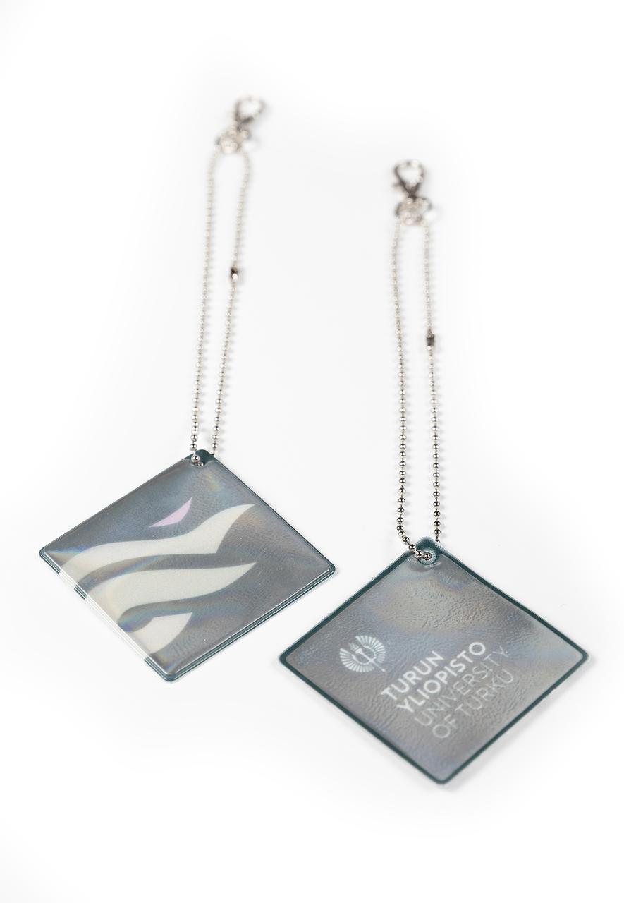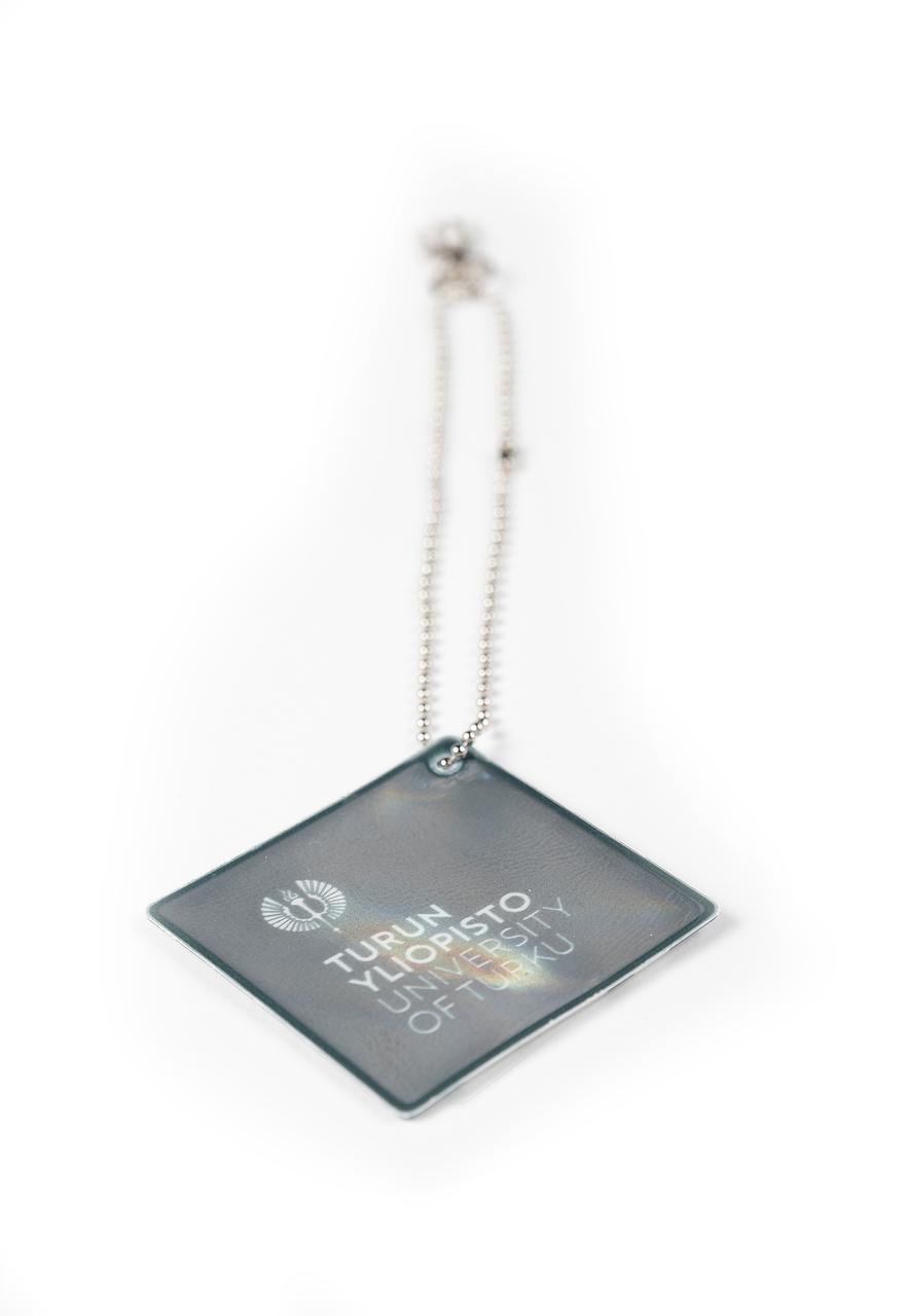 Heijastikalvon alle on toiselle puolelle painettu Turun yliopiston kaksikielinen logo ja toiselle puolelle liekkikuvio.